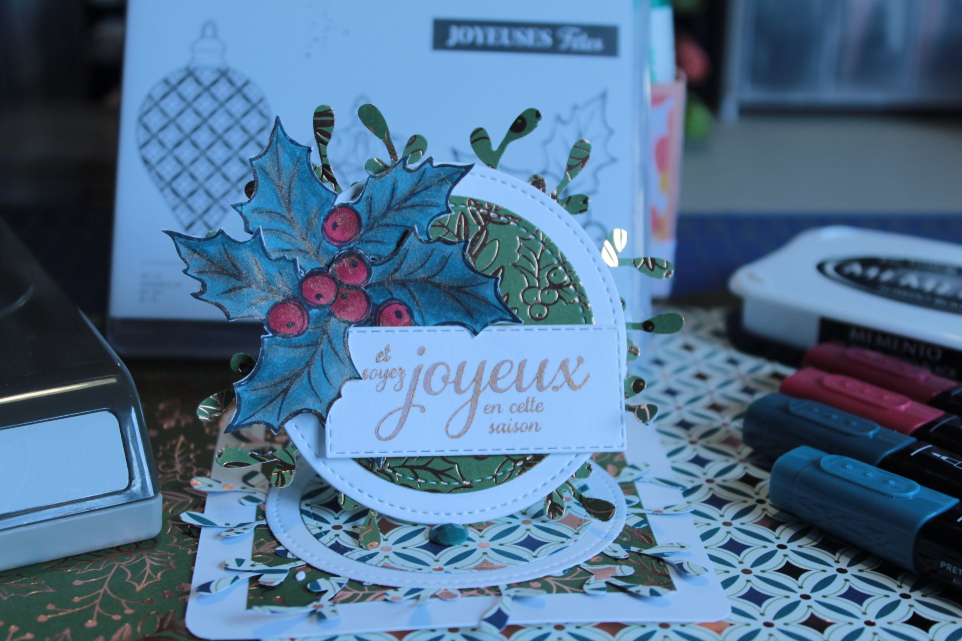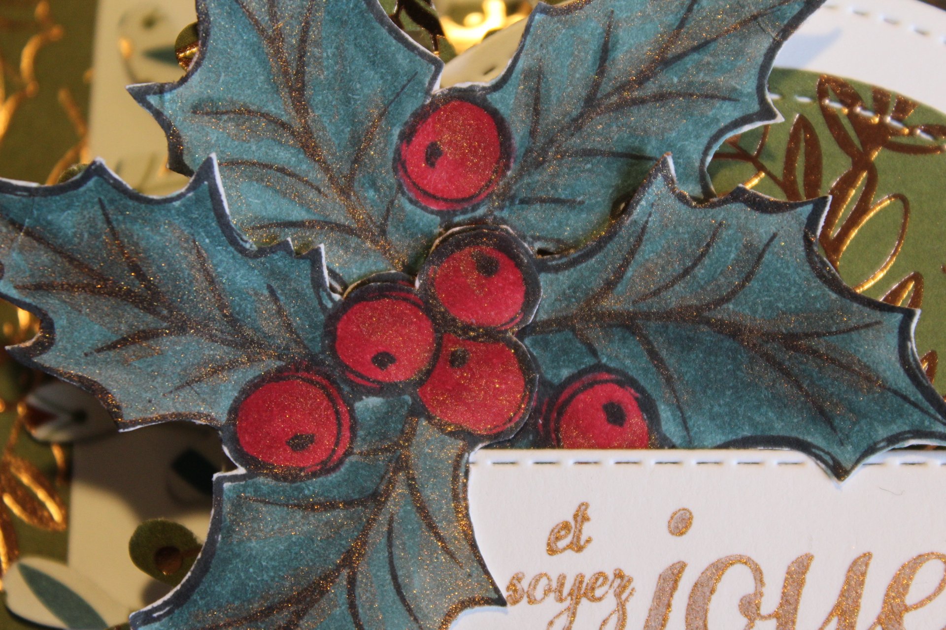 J’ai colorisé avec les Stampin’Blend « Paon Pimpant » (Réf 149560) et »Cerise Carmin » (Réf 144598) 3 branches de houx du set de tampons que j’ai détouré et superposé pour n’en faire qu’une. Pour donner une note festive, j’ai rajouté, à l’aide d’un aqua painter, une touche d’encre métallisée Delicata « Cuivre Céleste » (Réf 150707).