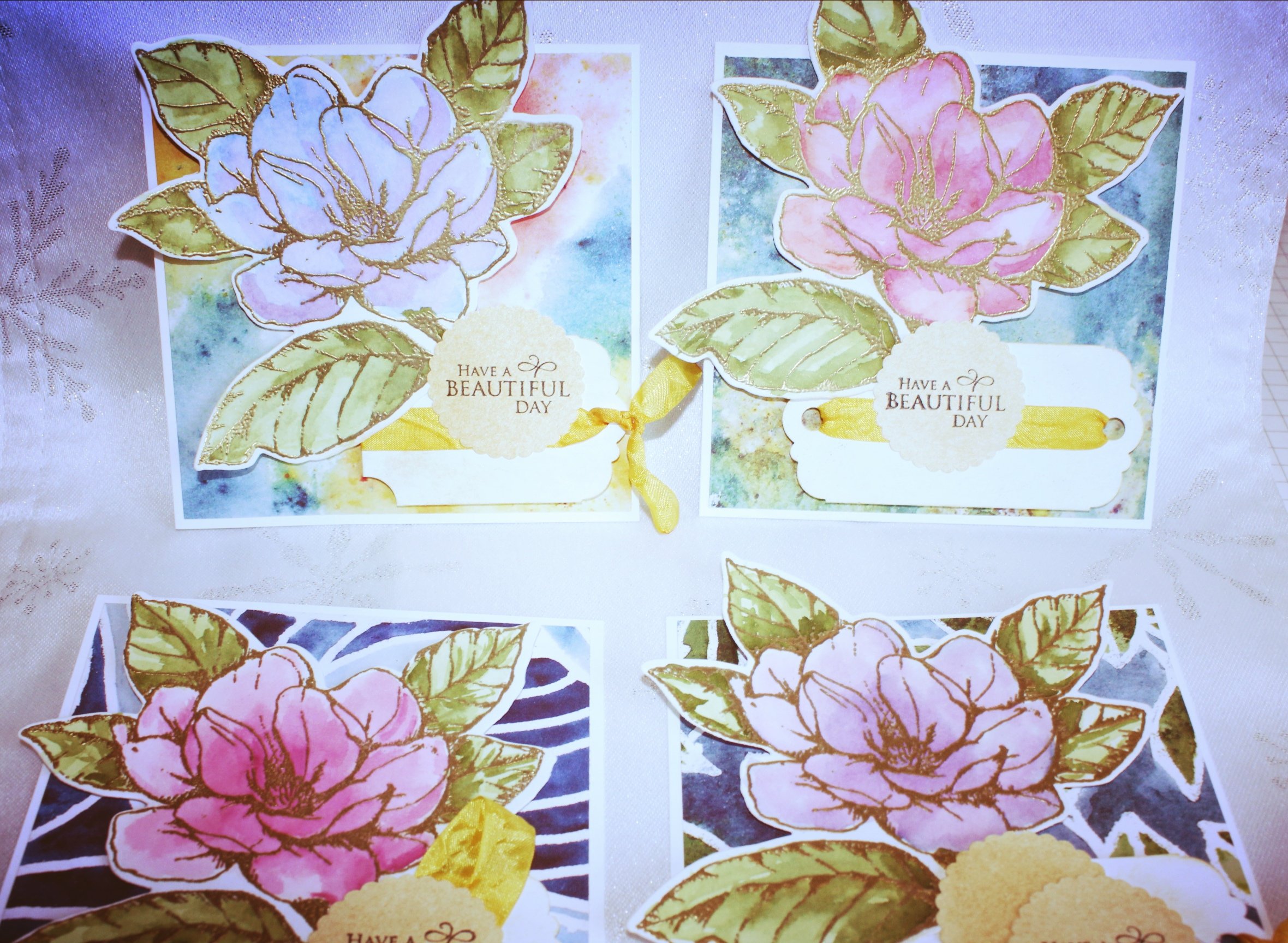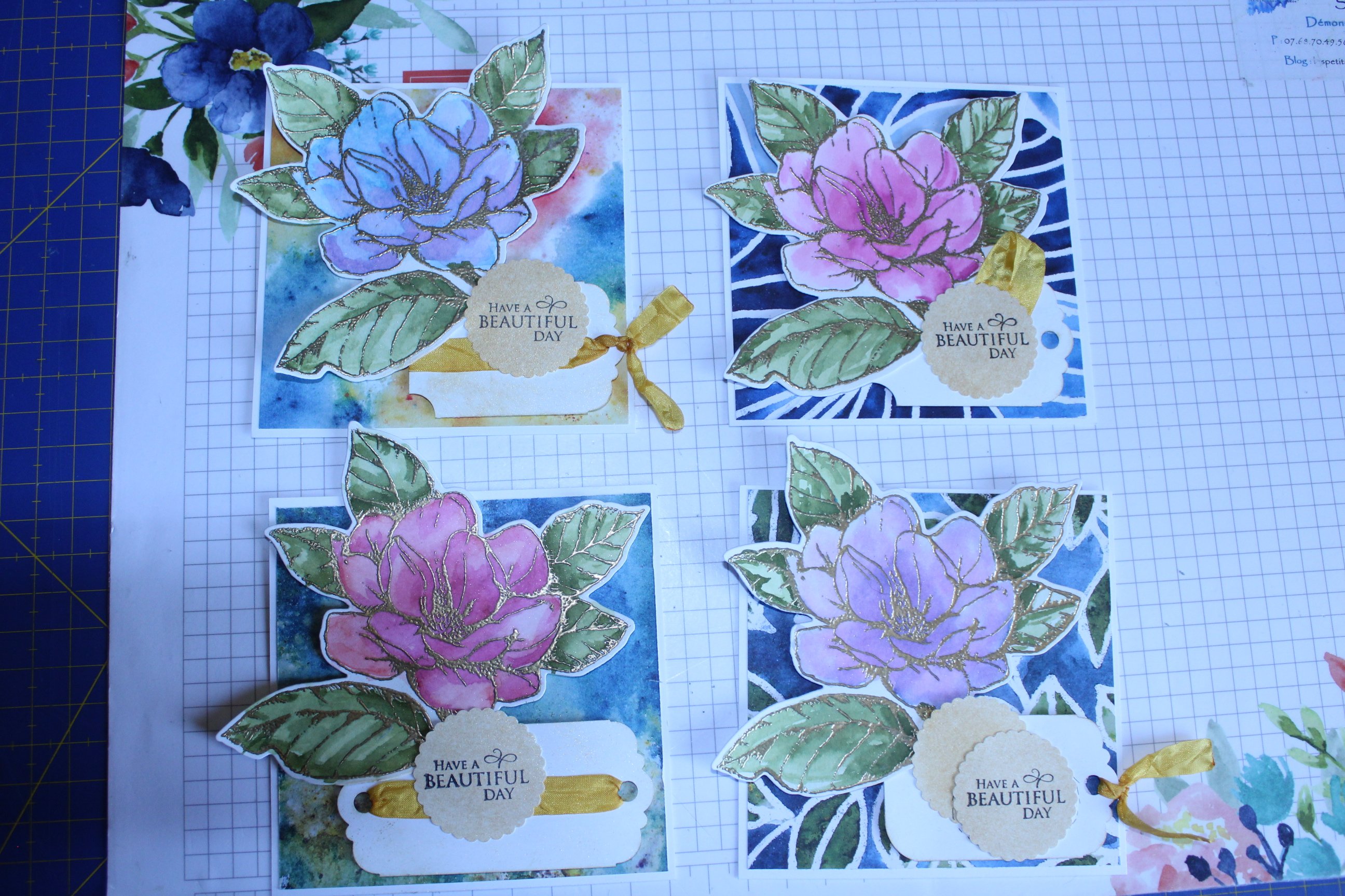 Je me suis fait un petit challenge : utiliser les mêmes produits et la même technique pour créer des cartes différentes…