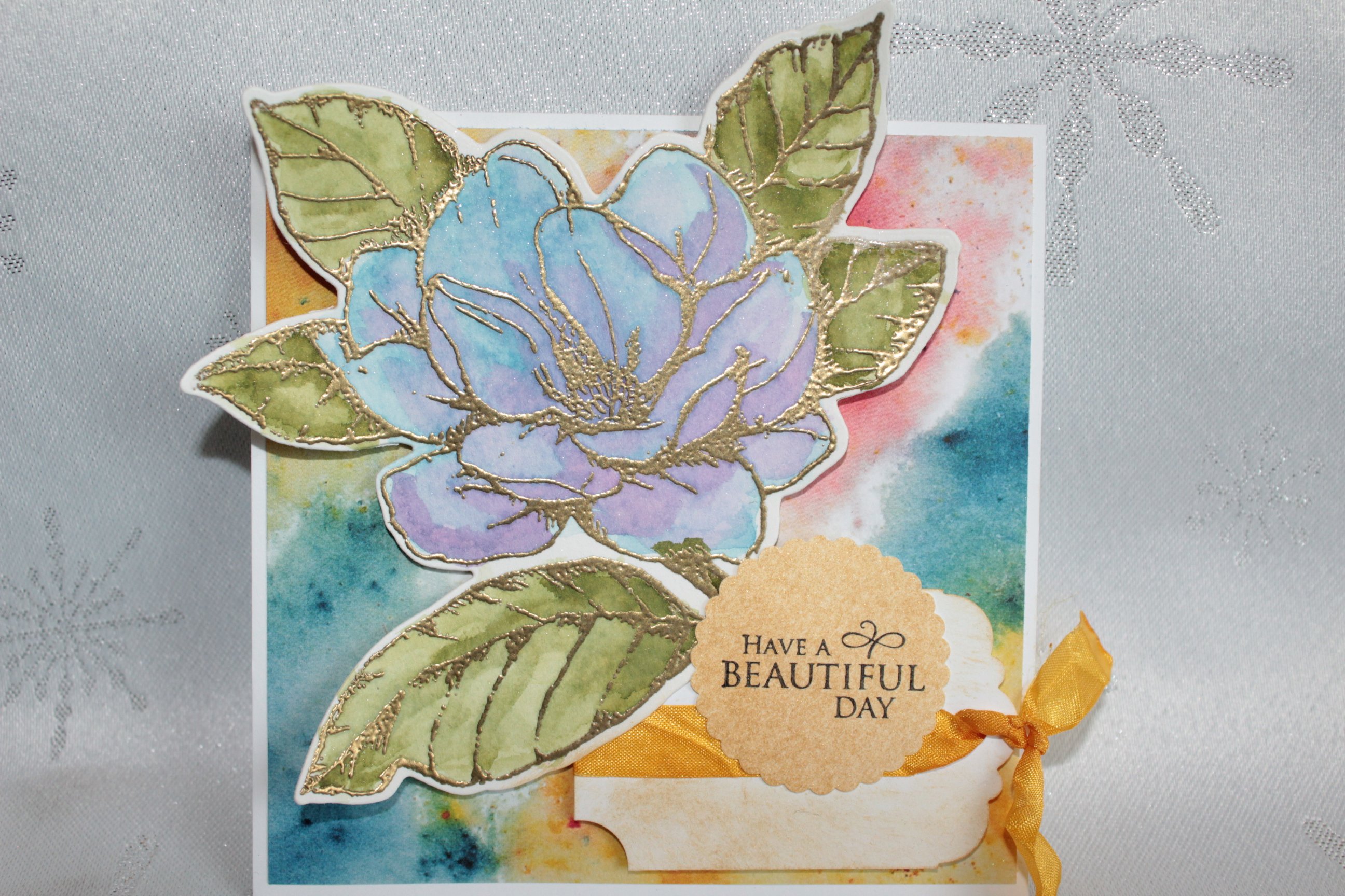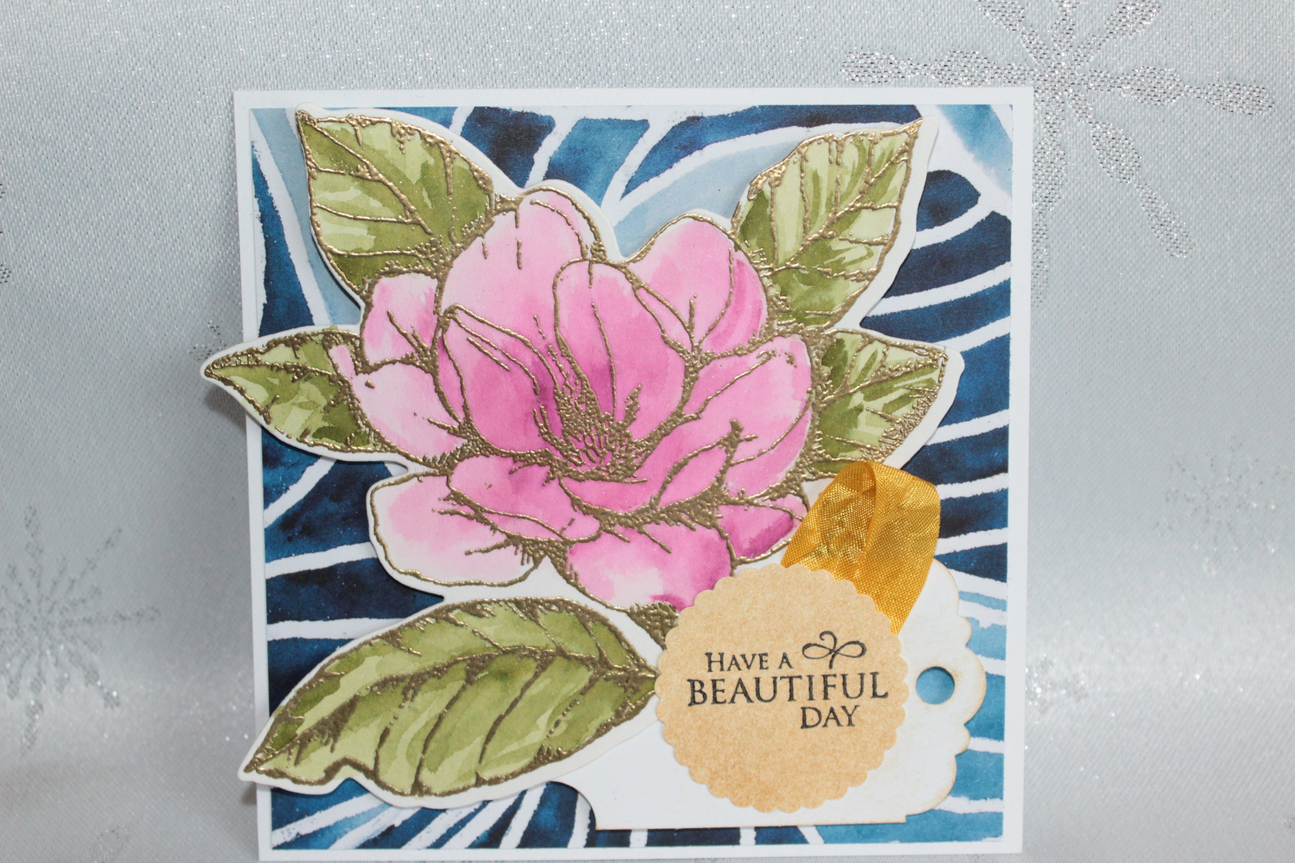 Pour la décoration, j’ai encré à l’encre Versamark cette grande fleur issue du set de tampons Allée des Magnolias avec mon Stamparatus et je l’ai embossée à chaud avec de la poudre à embosser or.