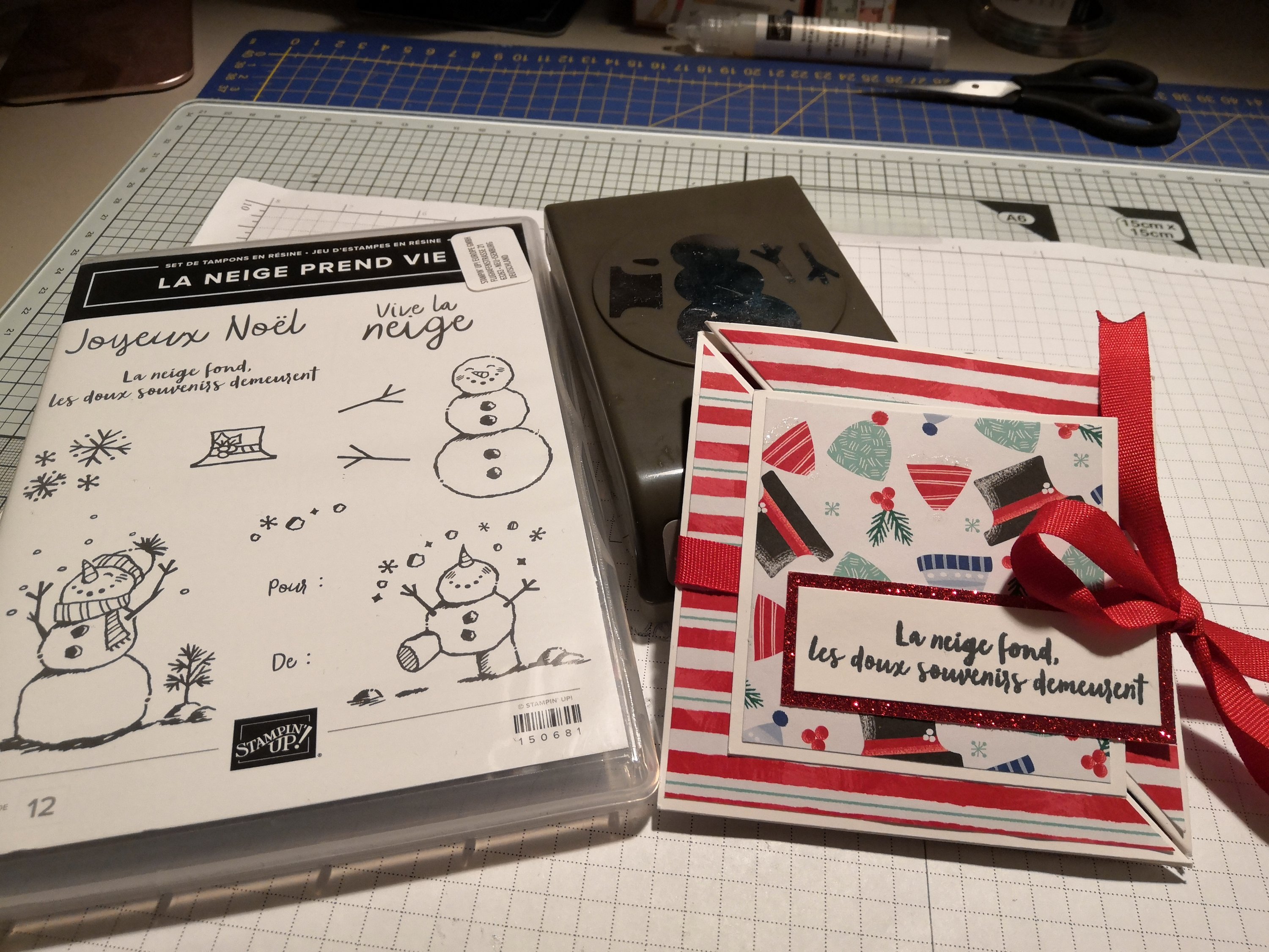 Pour la réaliser, j’ai utilisé du cardstock Murmure blanc pour la base et le joli papier design de la collection « Le Bonhomme de neige » du catalogue automne-hiver. Sans oublier le lot de tampons avec sa perforatrice associée « La neige prend vie »