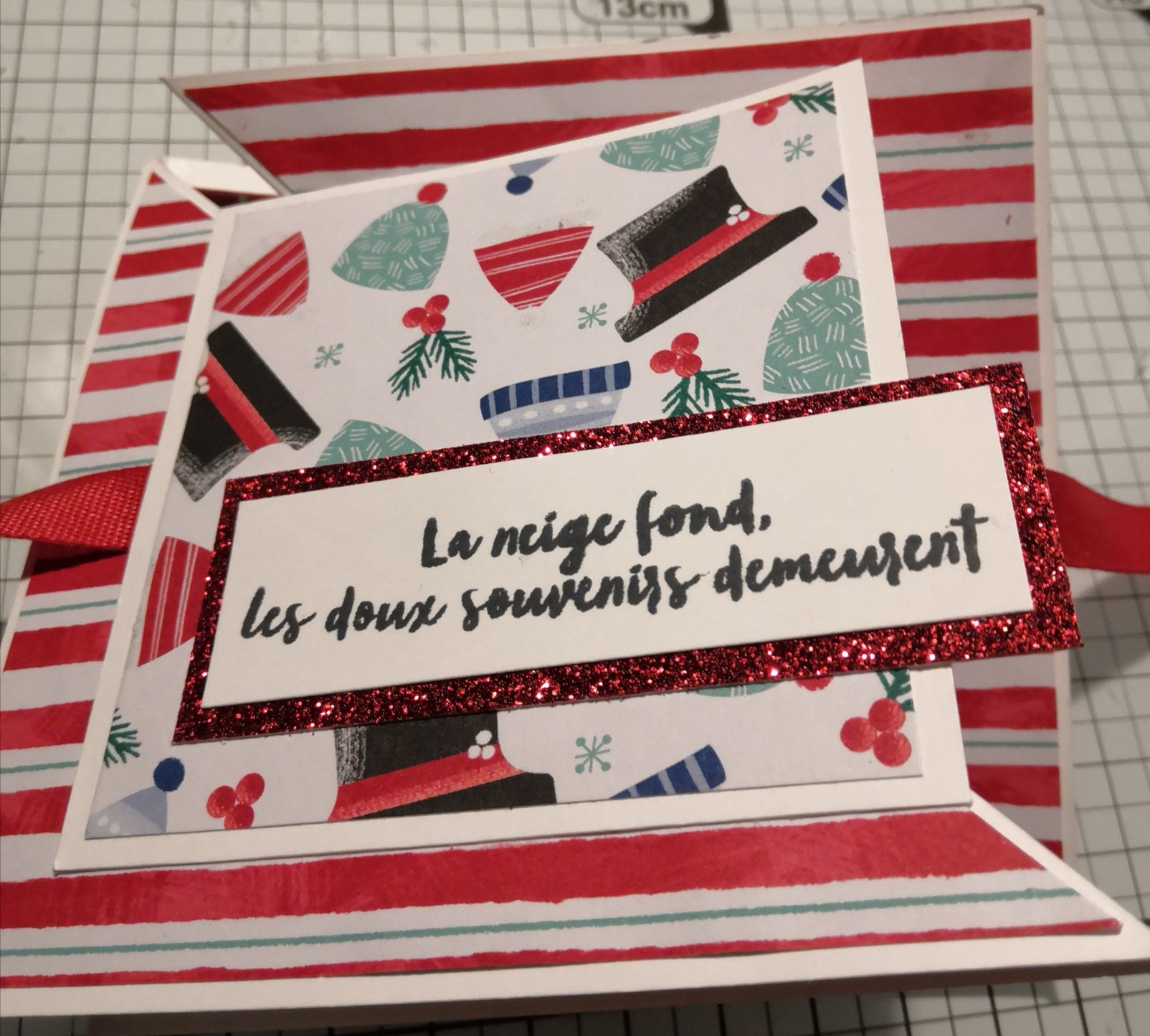 Pour mater l’étiquette j’ai utilisé du papier à paillettes rouge-rouge et la carte se ferme grâce à du ruban de coton Rouge-rouge du CA.