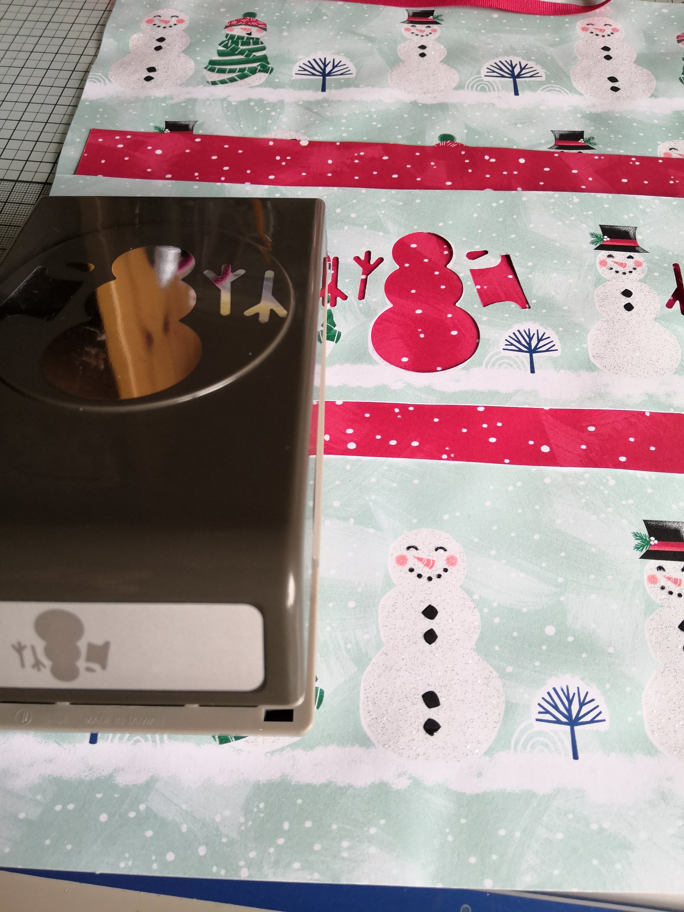 À l’intérieur, j’ai créé un embellissement Bonhomme de neige grâce au papier et la perforatrice.