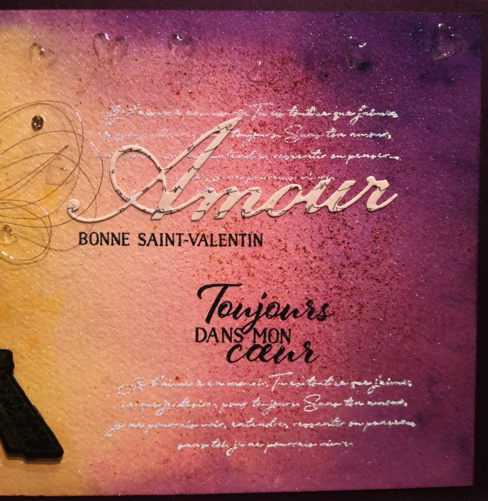 Sur le fond de carte, j’ai tamponné le joli texte du même lot que j’ai embossé à chaud avec la poudre à embosser « Blanc miroitant » (Réf. 149511 du CA) et les petits textes « Bonne Saint-Valentin » et « Toujours dans mon cœur » du set de tampons « Sentiments Éternels » (Réf.149816 du CA) à la Mémento.