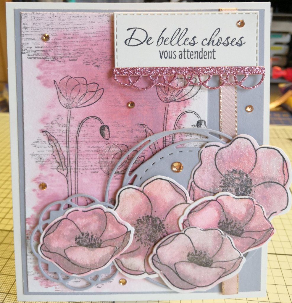 Une tendre carte rose et gris créée avec le merveilleux lot « Painted Popies »