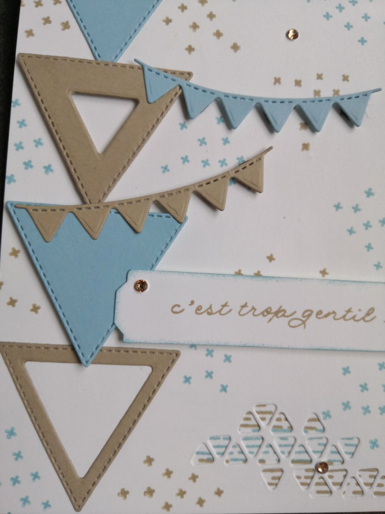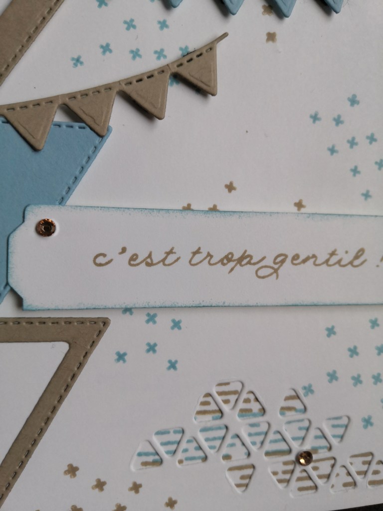En bas, à droite de la base « Murmure blanc », j’ai utilisé ce joli poinçon. Pour le faire ressortir, j’ai tamponné ces petits traits sur la carte. J’adore ces petits triangles !