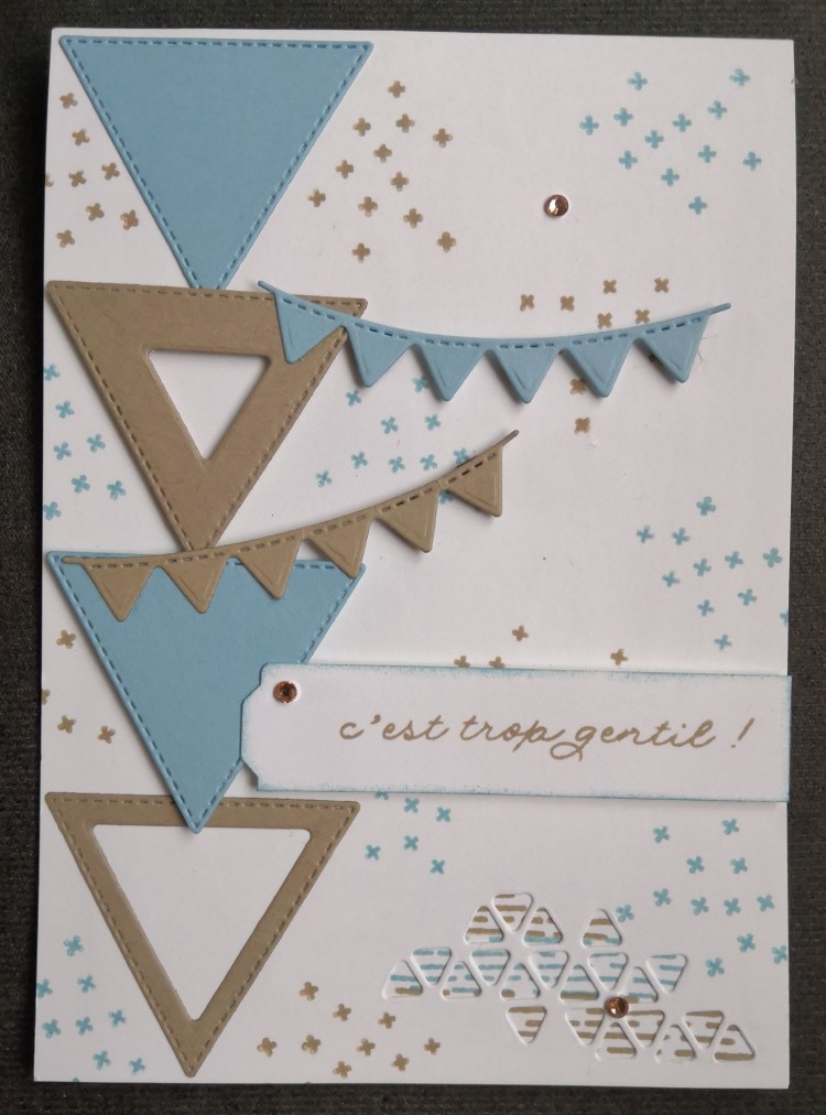 Pour ma part, je vous ai préparé une petite carte tout en douceur en utilisant le « Béguin bleu » et le « Brune dune ».