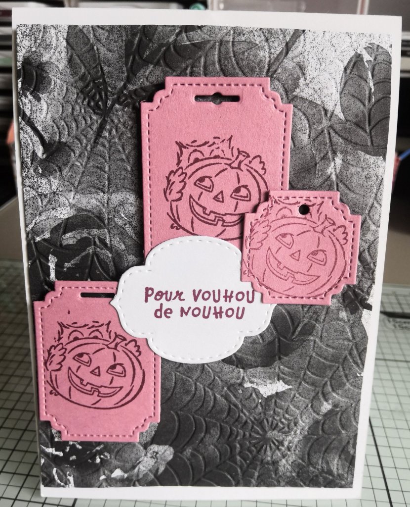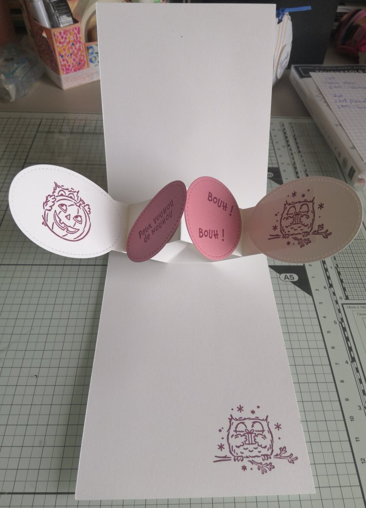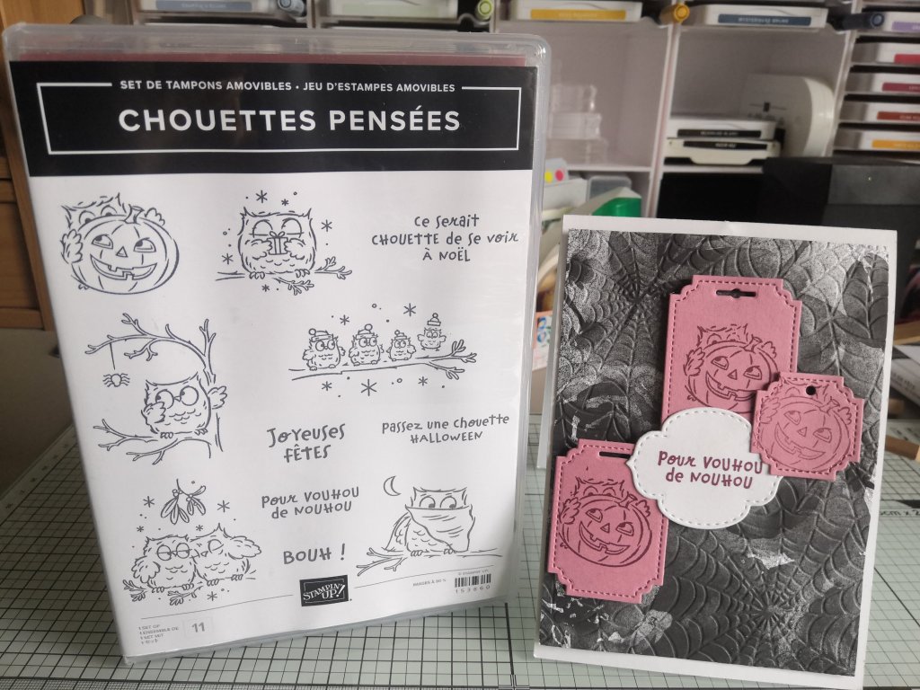 Pour ma part, je crée une petite carte twist d’halloween avec le set de tampons « Chouettes Pensées ».