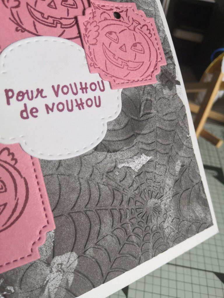 Pour la couverture, j’ai utilisé le papier design « Magie dans la nuit » que j’ai gaufré avec le plioir à gauffrage 3D « Toile d’araignée ».