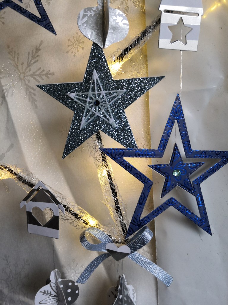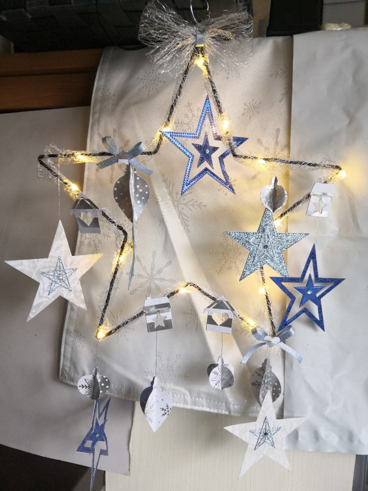 Sur un support en forme d’étoile acheté dans un magasin de déco, j’ai voulu l’habillé de bleu, de blanc et d’argent. Les papier design « Manteau de givre » (150444), « Poinsettia de velours » (153486) et le papier à paillettes Béguin Bleu (153513) s’y prêtent bien. J’ai utilisé aussi un papier de l’ancien catalogue « Paon majestueux »