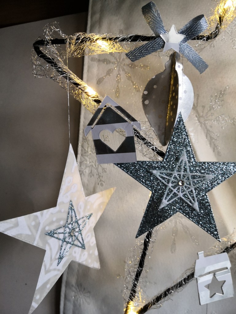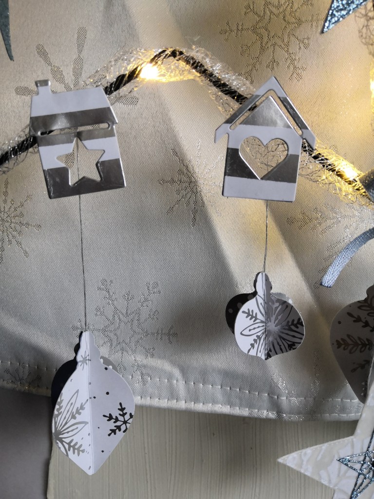Pour la décoration, j’ai utilisé les poinçons « Etoiles à coudre » (150653), « Ensemble à la maison » (153515) et le duo de perforatrices « Ornements étincelants » (150647).