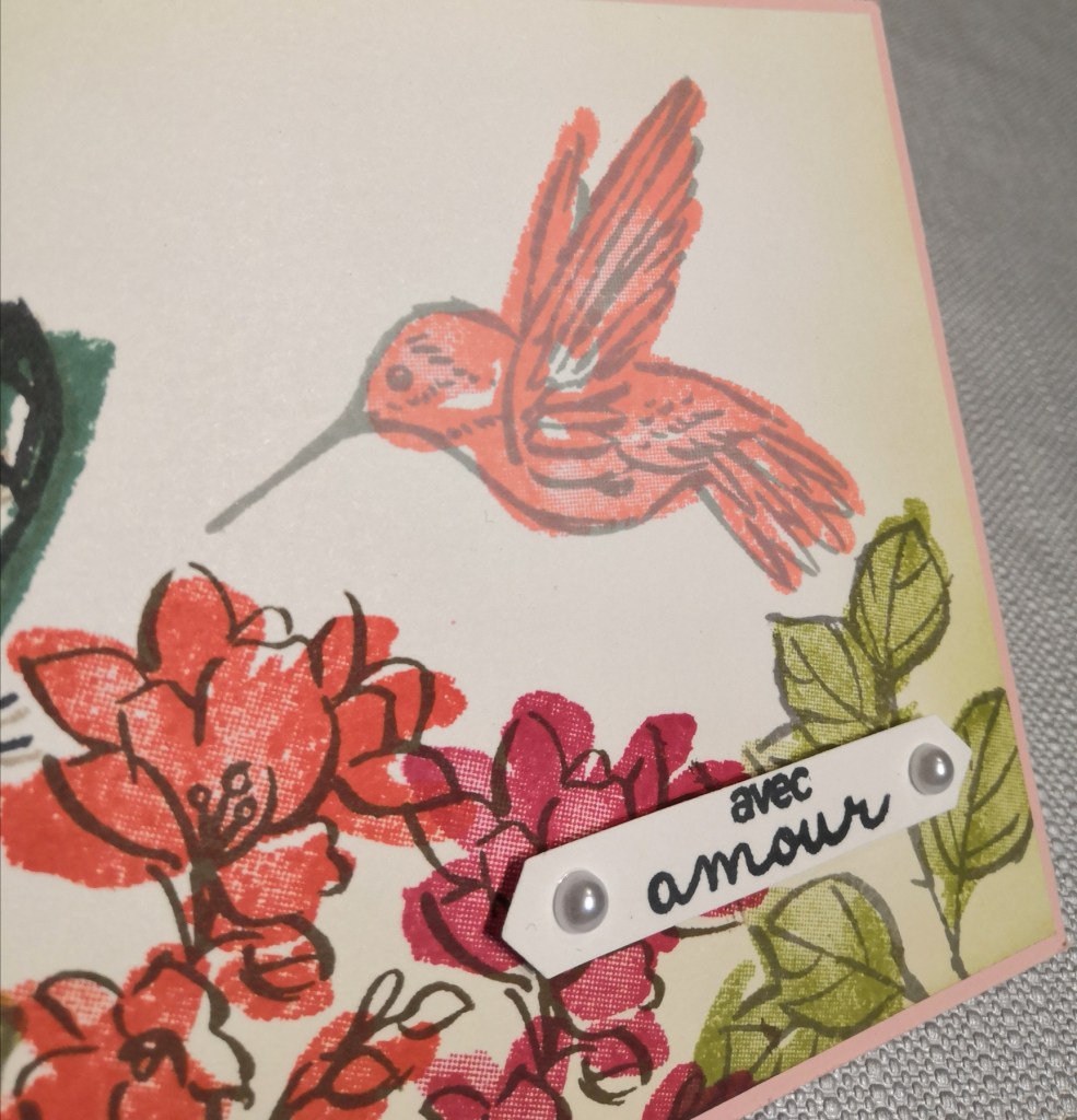 Le sentiment provient du set « Havre d’hortensia » que vous découvrirez le 5 janvier prochain dans le nouveau mini-catalogue janvier-juin 2021. J’ai utilisé la perforatrice « Etiquette classique » et rajouté deux demie-perles.