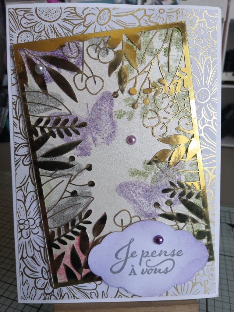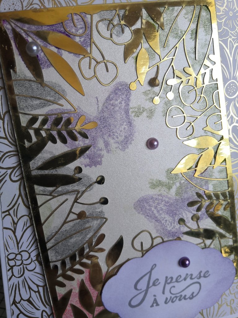 Pour cette carte, j’ai utilisé le papier de la série design « Jardin Ornemental » (Réf 152488 du CA), le papier spécialité « Nacré » de la collection « Sable et Mer » (Mini-catalogue J. J. 21) et d’un cadre provenant du papier Spécialité Decoupé au laser « OR pour toujours » (Réf 152493 du CA)