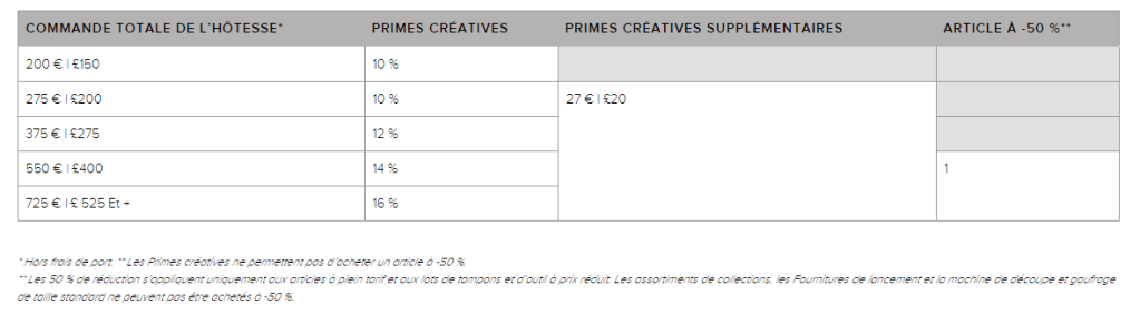 Du 4 mai au 14 juin 2021, les commandes qui atteignent le palier recevront nos généreuses Primes créatives PLUS des récompenses supplémentaires ! Accueillir un atelier permet de gagner des Primes créatives en fonction du montant total des ventes de l’atelier. Les commandes individuelles en dehors d’un atelier et qui atteignent les paliers de ventes montrés ici ont aussi droit à ces Primes créatives supplémentaires.