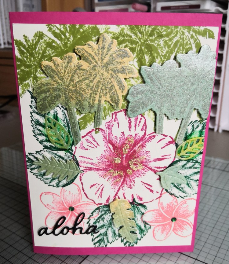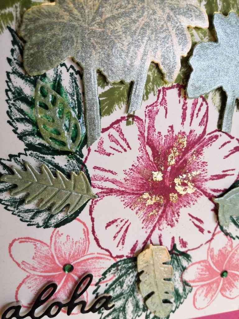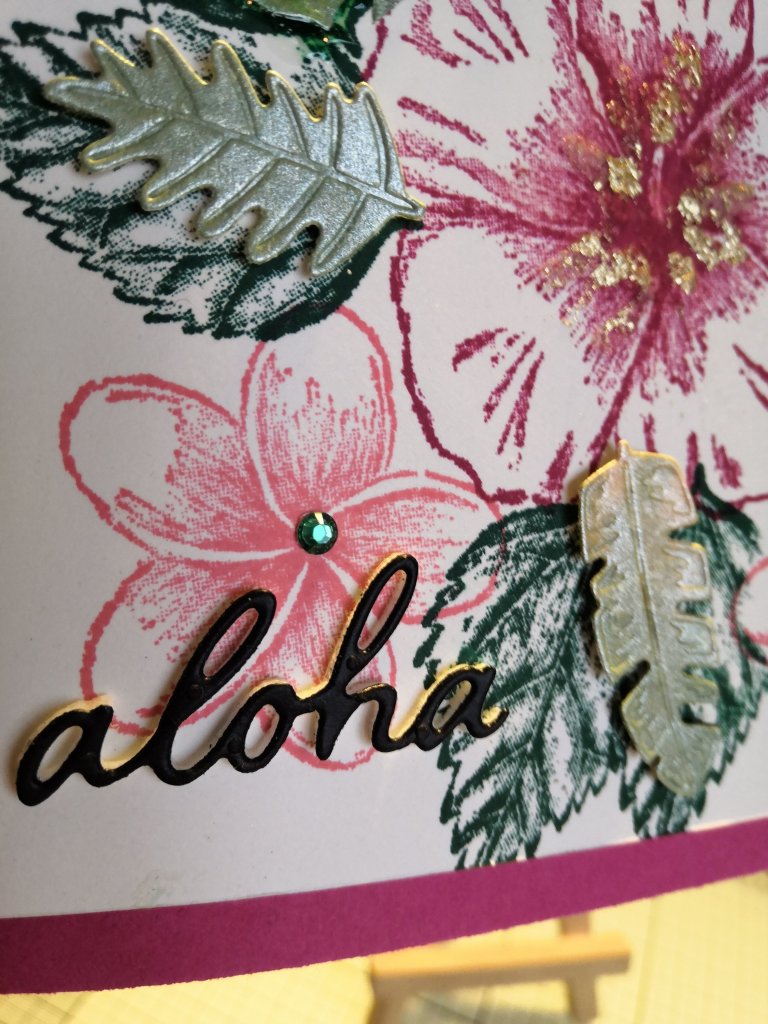 J’ai découpé le sentiment « Aloha » du lot de poinçons « Dans les Tropiques » (Réf. 151495 du CA) sur du Cardstock noir collé en 3D grâce aux feuilles adhésives en mousse (Ref. 152815 du CA)