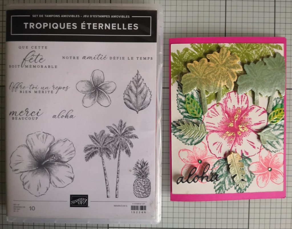 Le thème de ce mois est les vacances, alors j’ai ressorti mon joli set de tampons » Tropiques Éternelles »(Réf. 152266 du CA) et ses poinçons coordonnés.