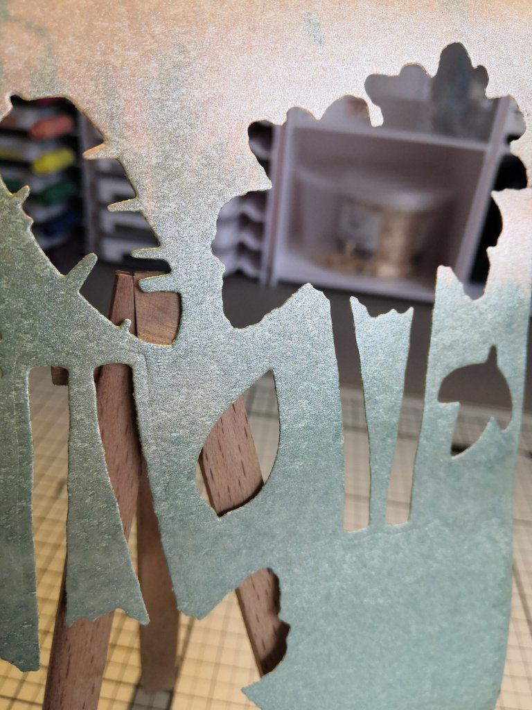 Pour les découpes, je me suis amusée au préalable avec mes encres de la collection « Brillants » pour créer un fond sur du papier Spécialisé Nacré (Réf. 154291 du CA) qui donne un joli rendu irisé.