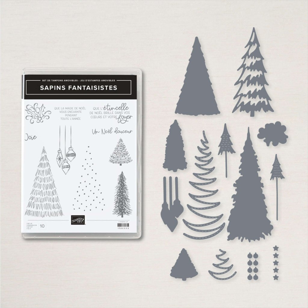 Pour la déco, j’ai juste utilisé une découpe des poinçons « Sapins de Noël » (Réf. 156339) coordonnés au set de tampons que j’ai collé en 3D grâce aux Stampin’Dimensional.