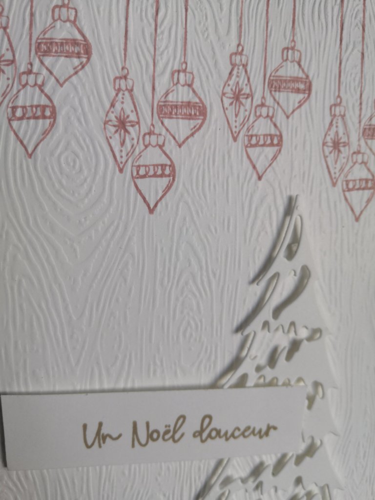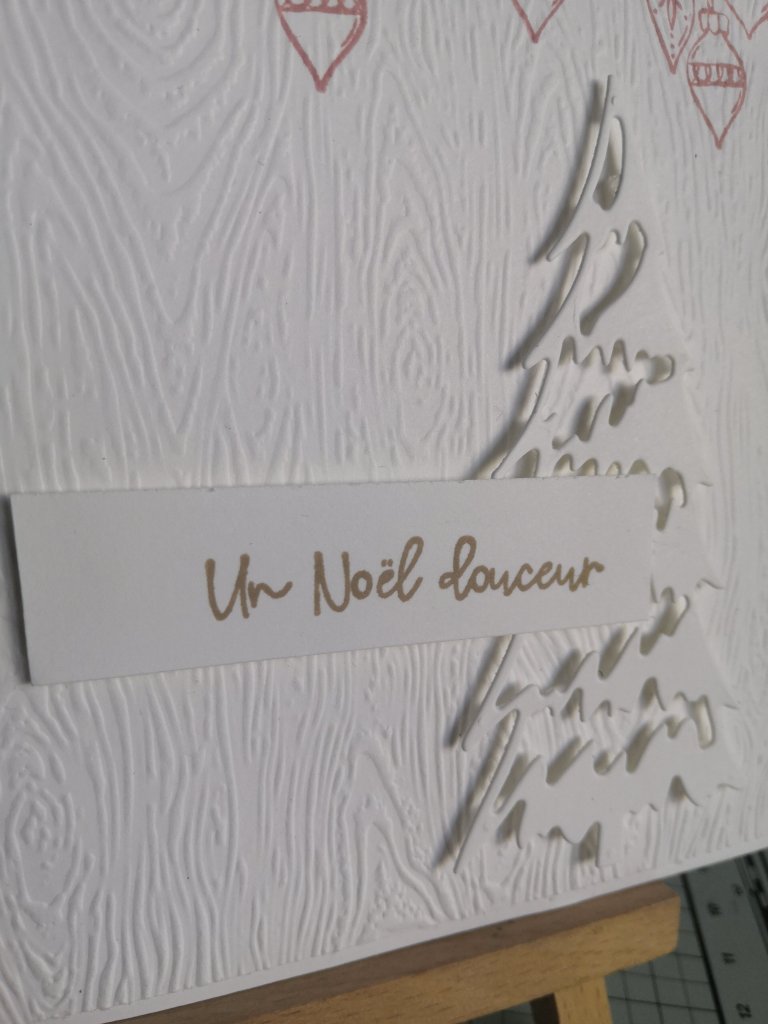 Sur du Cardstock Blanc Simple, j’ai tamponné en Fleur de cerisier ces jolies boules de Noël provenant du set de tampons « Sapins Fantaisistes » (Réf. 156333 du MC) avant de le gaufrer. Puis, je l’ai collé sur la base de carte.