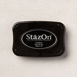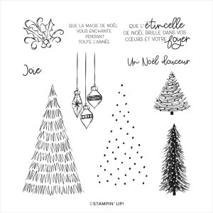 Pour l’étiquette, j’ai tamponné un sentiment provenant du set de tampons « Sapins Fantaisistes » sur du papier Vélin avec de la « Stazon ». En effet, le vélin ayant un aspect plutôt plastifié, il faut une encre à alcool pour qu’elle sèche plus vite 😉