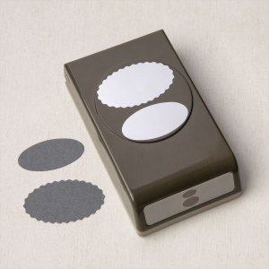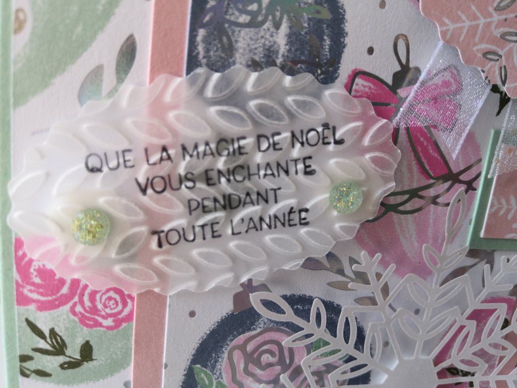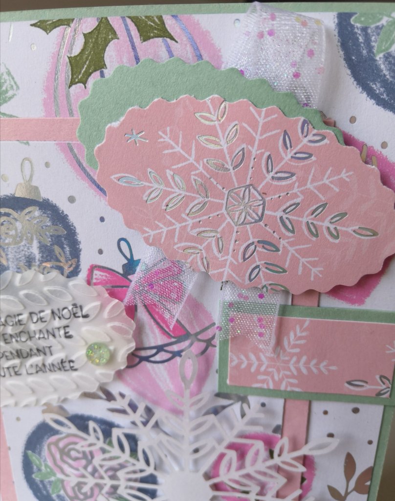 Pour la déco, j’ai encore utilisé la perforatrice « Deux Ovales » dans du Cardstock Macaron à la menthe et du papier design et j’ai rajouté du ruban D’Organza Pailleté Blanc avant de le collé en 3D.