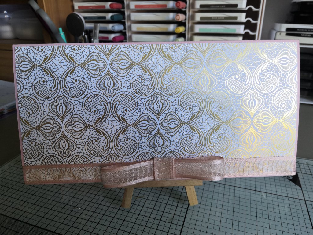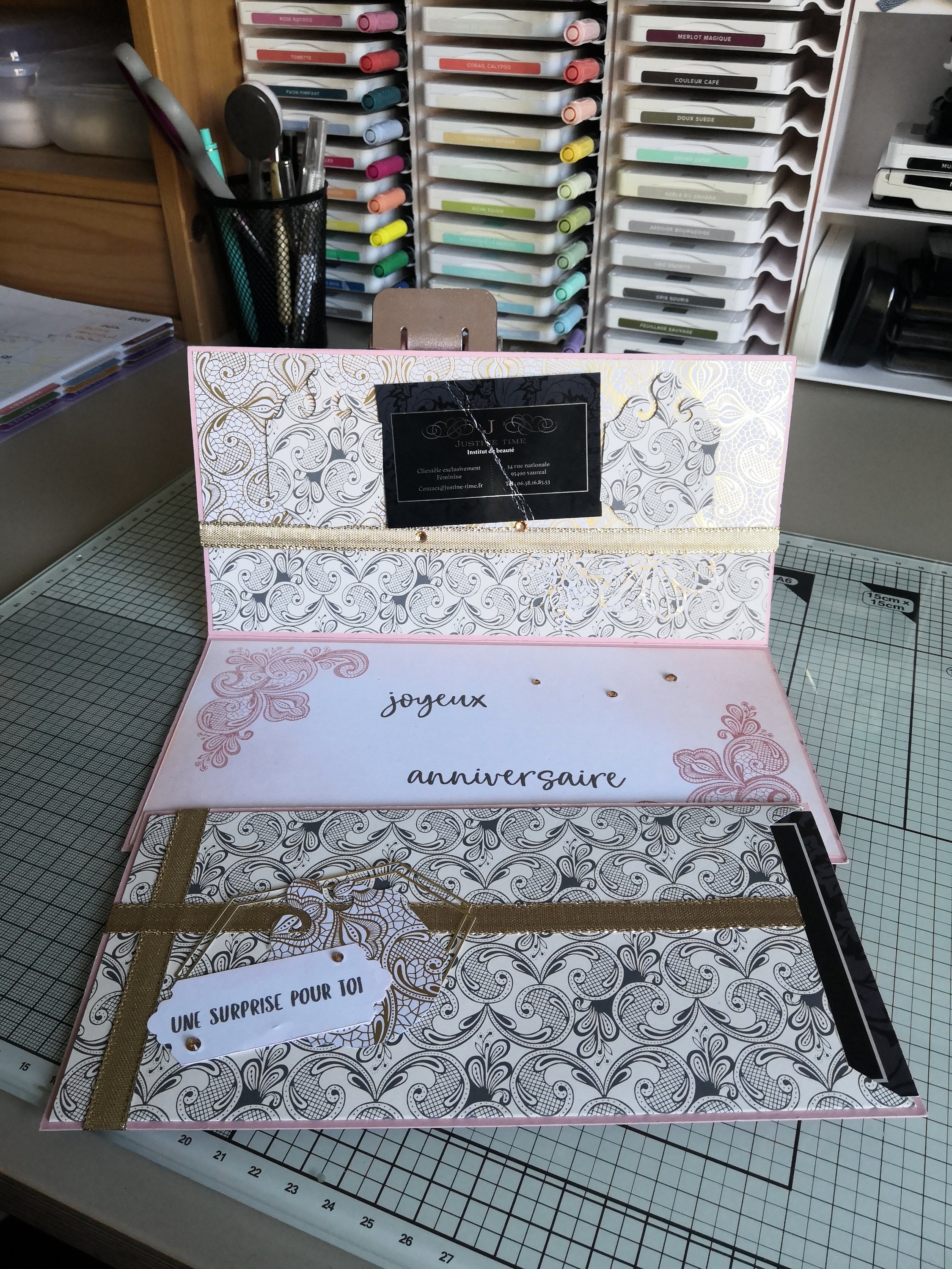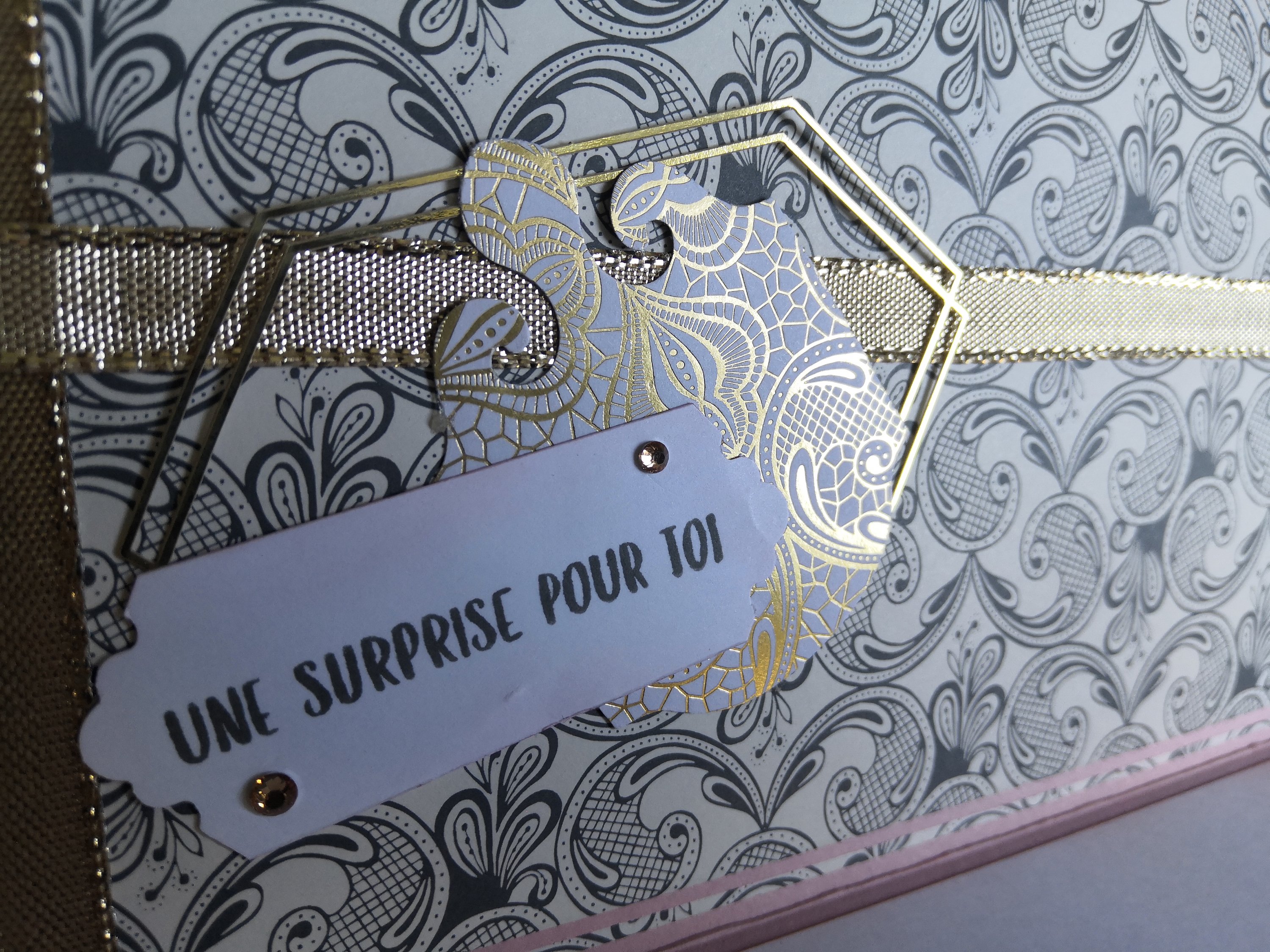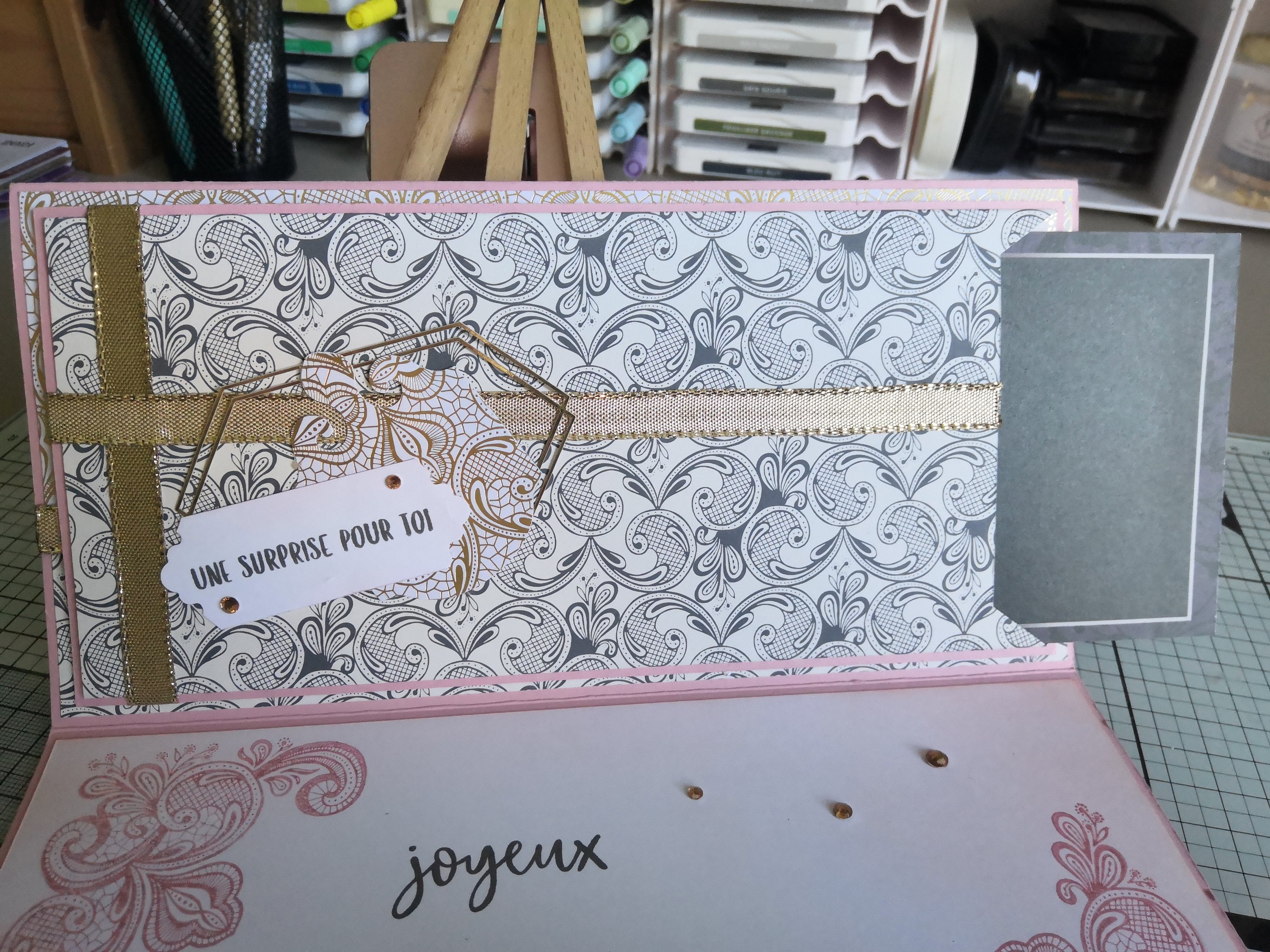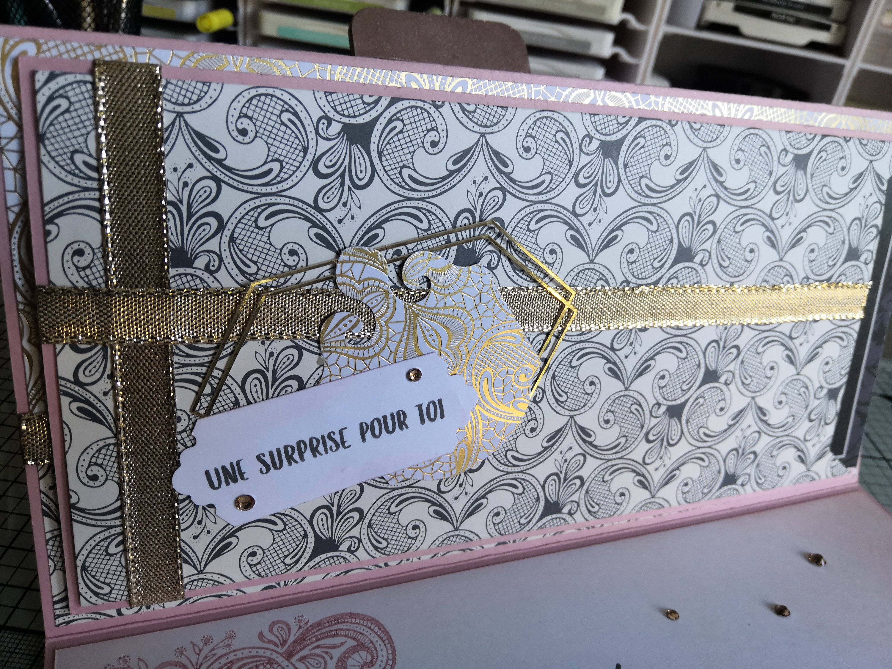 J’ai créé une jolie pochette pour y glisser un chèque-cadeau que j’ai décoré avec du ruban miroitant or, une découpe du « Lot Éphémère Encre Animée » et de la perforatrice « Étiquette Aristocratique ».