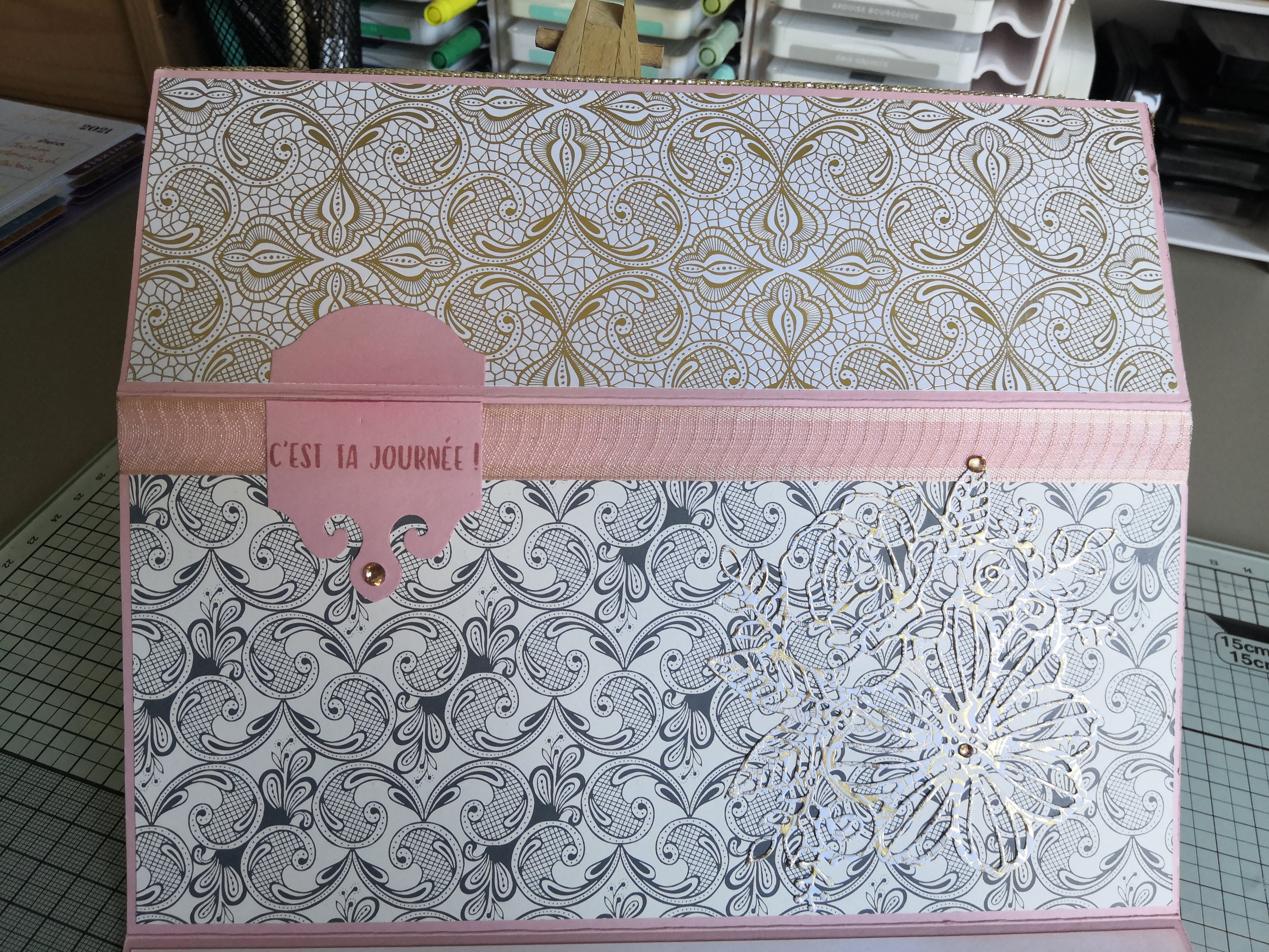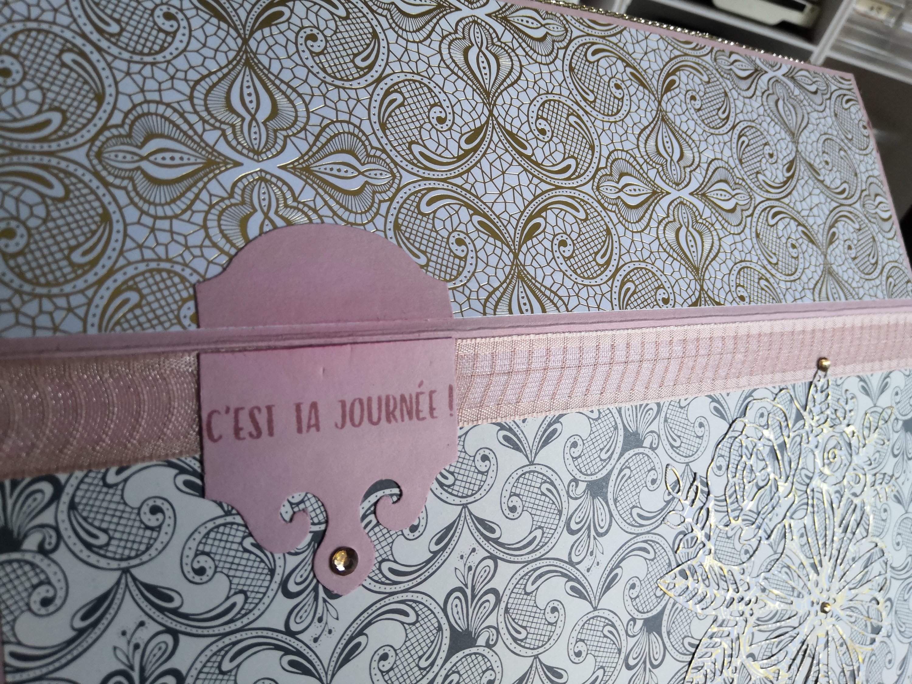 J’ai fignolé la déco avec du ruban d’Organdi Rayé Pétale Rose et de strass Champagne que vous retrouvez un peu partout.