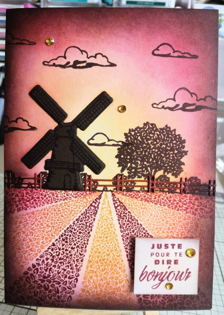 Pour cette dernière, j’ai utilisé mes Brosses Estompe pour ce paysage. J’ai adoré tamponné ce décor grâce au set de tampons « Tulip Fields » (Réf. 157682 du mini-catalogue). Ses poinçons coordonnés « Champs de moulins à vent sont de toute beauté ! (Réf. 157683)