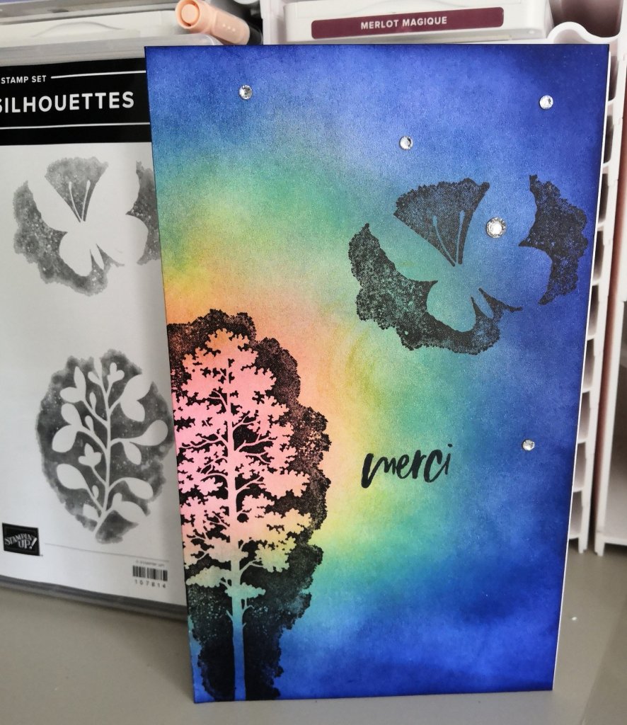 J’ai utilisé le set de tampons « Amazing Silhouettes (Réf. 157214) et un sentiment provenant du set de tampons » Bonjour ma chérie » (Réf. 158043) que j’ai encré à la Mémento.