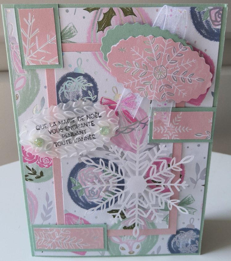 Bonjour à tous ! J’espère que vous allez bien. Aujourd’hui, je vous présente une jolie carte créé avec le papier design « Splendide Fantaisie » du mini-catalogue juillet-décembre 2021. Je suis tombée en amour devant ce magnifique papier ! Sur une base de carte « Macaron à la menthe », j’ai collé du papier à motifs que j’avais évidé […]